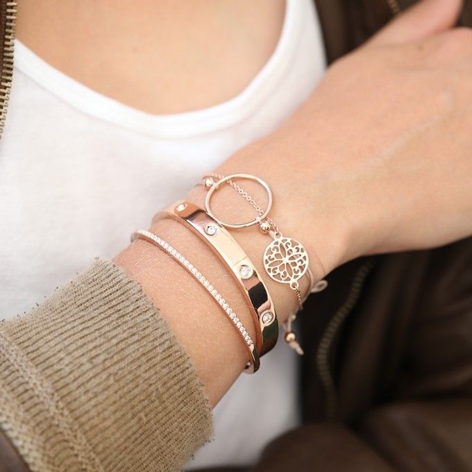 Un elegante colpo d'occhio! Cinque cristalli delicatamente incastonati si uniscono in questo braccialetto placcato oro rosa come se fossero sempre appartenuti l'uno all'altro. DM 7 cm