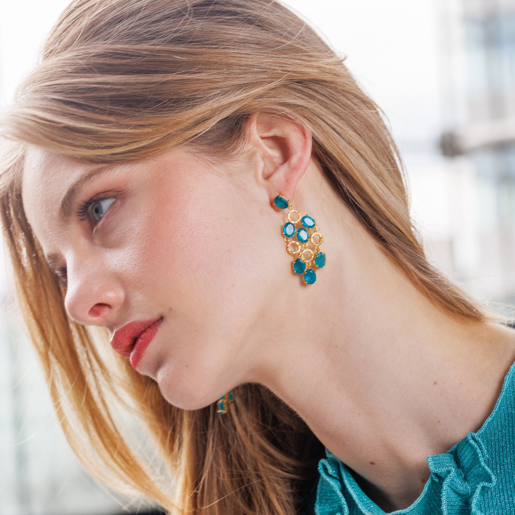 Orecchini unici placcati in oro con pietre di giada autentiche in tonalità turchesi scintillanti. Le pietre sono incastonate a mano e rendono gli orecchini un incredibile richiamo visivo. Lunghezza totale circa 5,5 cm.
