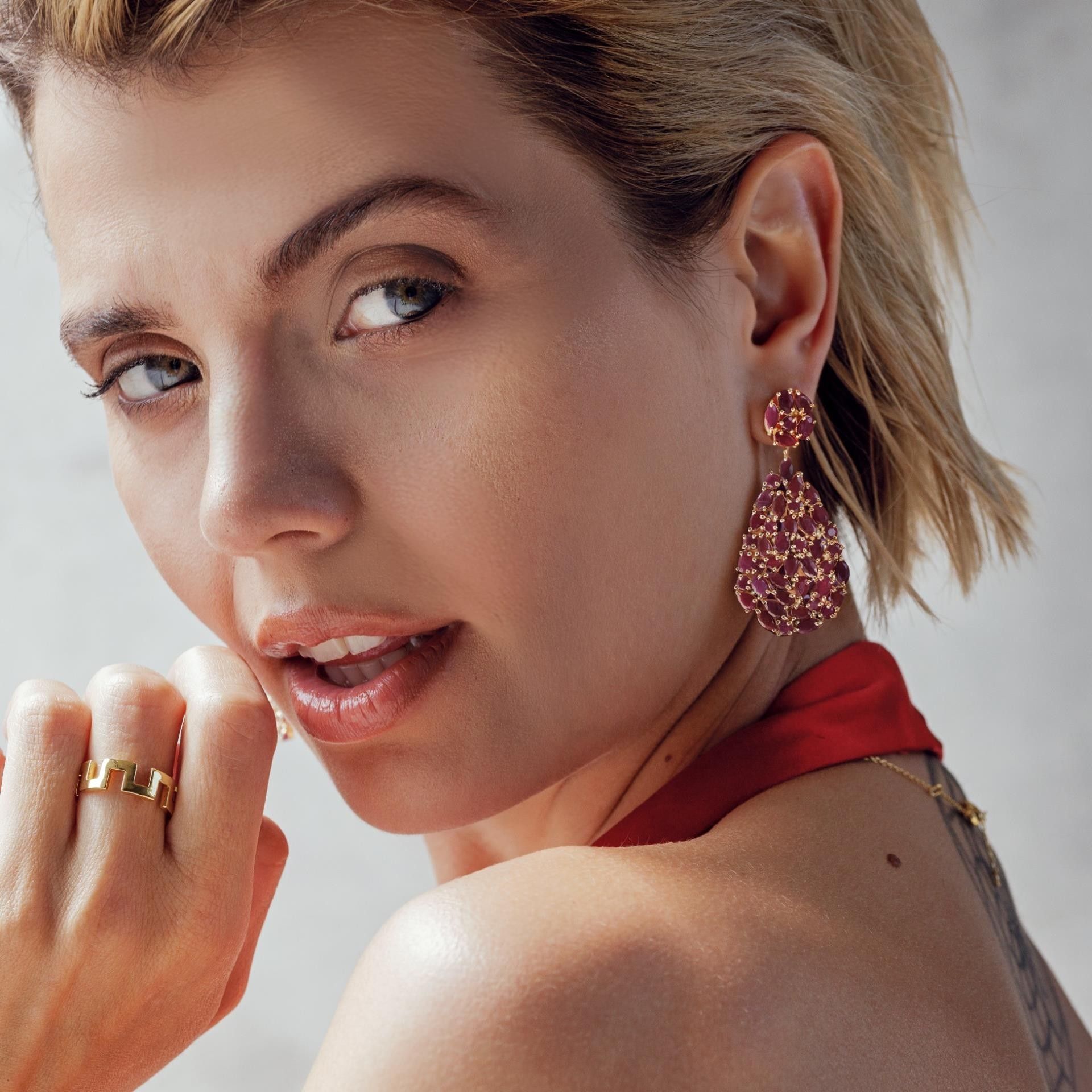 Orecchini unici, placcati in oro, con rubini autentici tagliati e incastonati singolarmente. Tutte le pietre sono incastonate a mano e fanno di questo orecchino un richiamo visivo particolarmente prezioso. La lunghezza totale degli orecchini è di circa 5,5 cm.