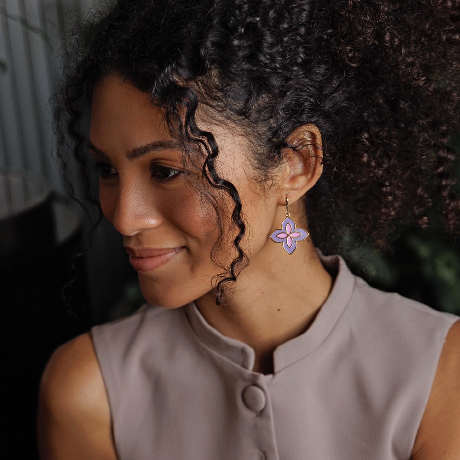 Questi splendidi orecchini a fiore placcati in oro sono smaltati in viola e rosa. Un design estivo, giocoso ma molto elegante. Lunghezza del pendente circa 3 cm.